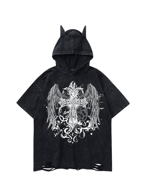 Übergroßes Kurzarm-T-Shirt mit Kapuze und Flügel-Print für Herren