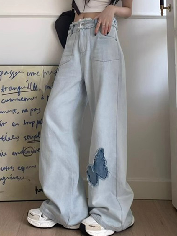 Blaue Jeans mit weitem Bein und hohem Bund und Schmetterlingsmuster