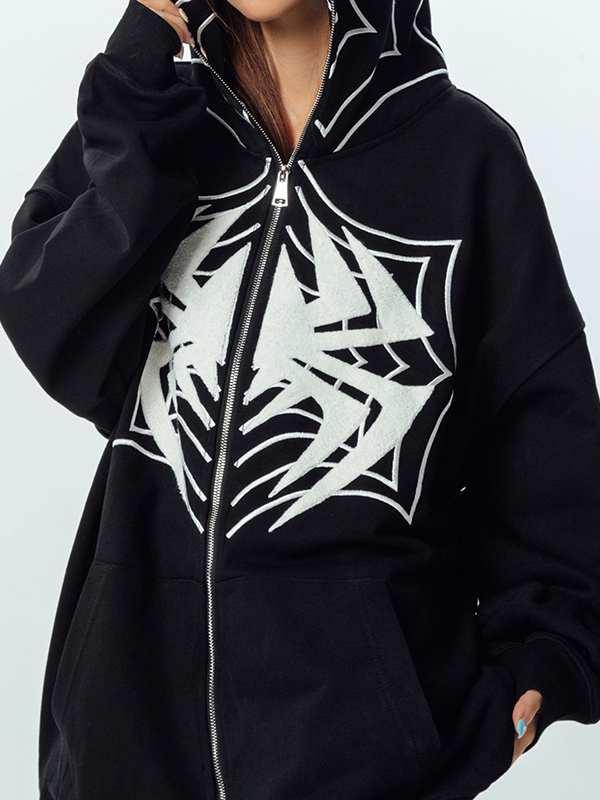 Kontrastfarbener, übergroßer Kapuzenpullover mit Spinnenmuster und durchgehendem Reißverschluss