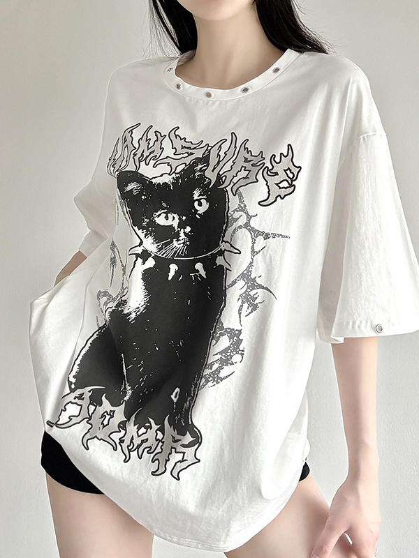 Lockeres T-Shirt mit dunklem Katzen-Print und perforiertem Rundhalsausschnitt