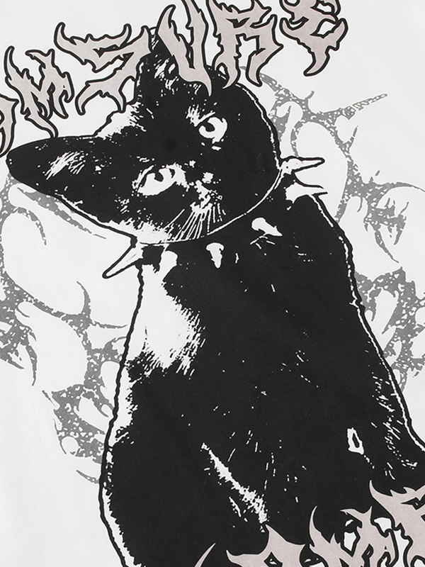 Lockeres T-Shirt mit dunklem Katzen-Print und perforiertem Rundhalsausschnitt Menge