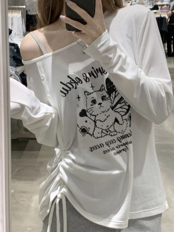 Schulterfreies Oversized-Langarm-T-Shirt mit Katzen-Print