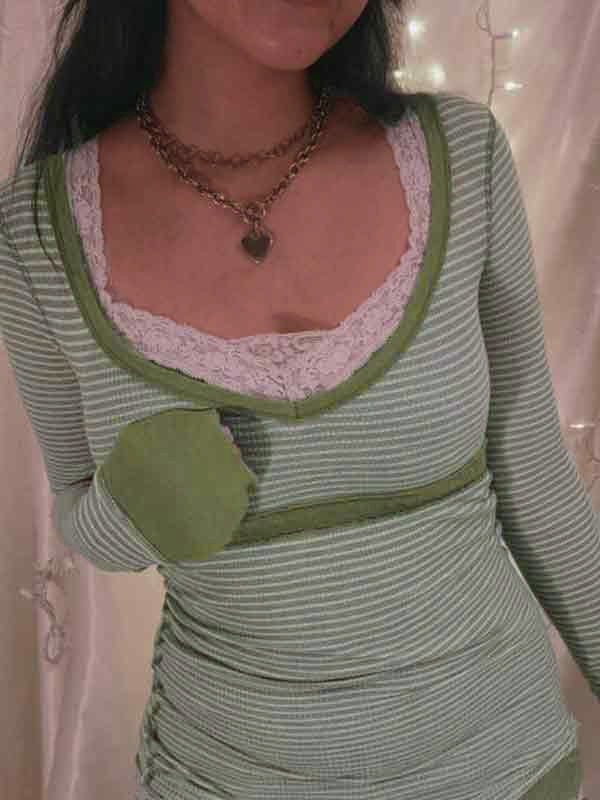 Streifen-Patchwork, U-Ausschnitt, schmaler, langärmliger Strick