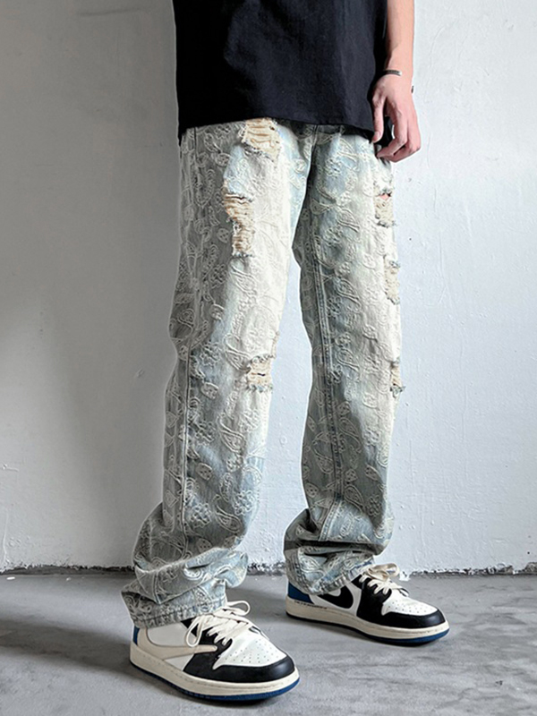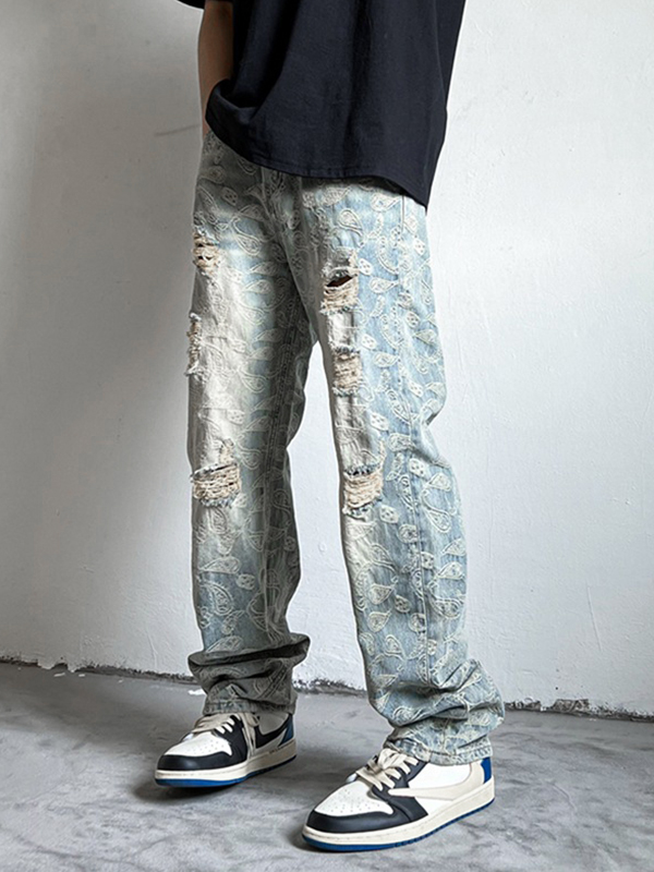 Zerrissene, lockere Herrenjeans mit Cashew-Blumenmuster