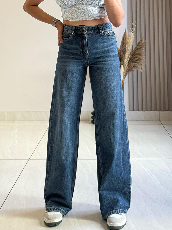 Blaue Jeans mit weitem Bein und hohem Bund und Schmetterlingsmuster