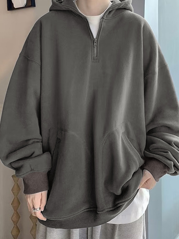 Einfarbiger, übergroßer Fleece-Kapuzenpullover mit halbem Reißverschluss für Herren
