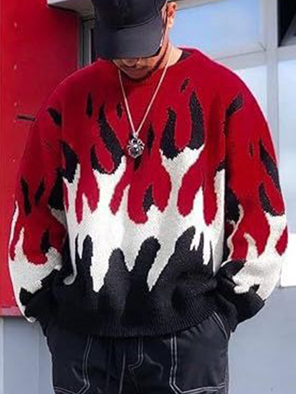 Herren-Pullover mit Rundhalsausschnitt aus kontrastfarbenem Flammen-Jacquard