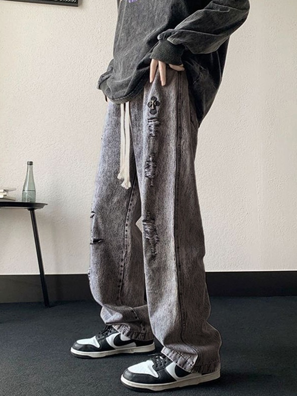 Lose Herrenjeans mit zerrissenem Kordelzug in grauer Waschung