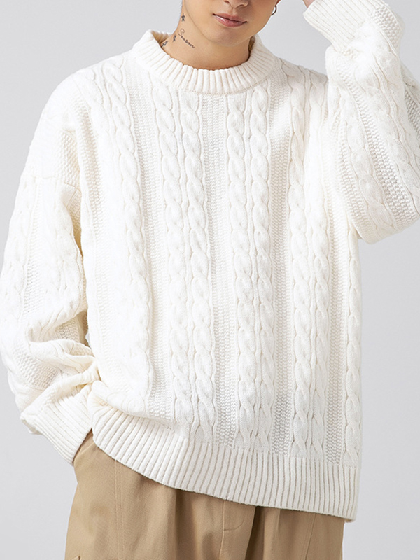 Einfarbiger Pullover mit Rundhalsausschnitt und Zopfmuster