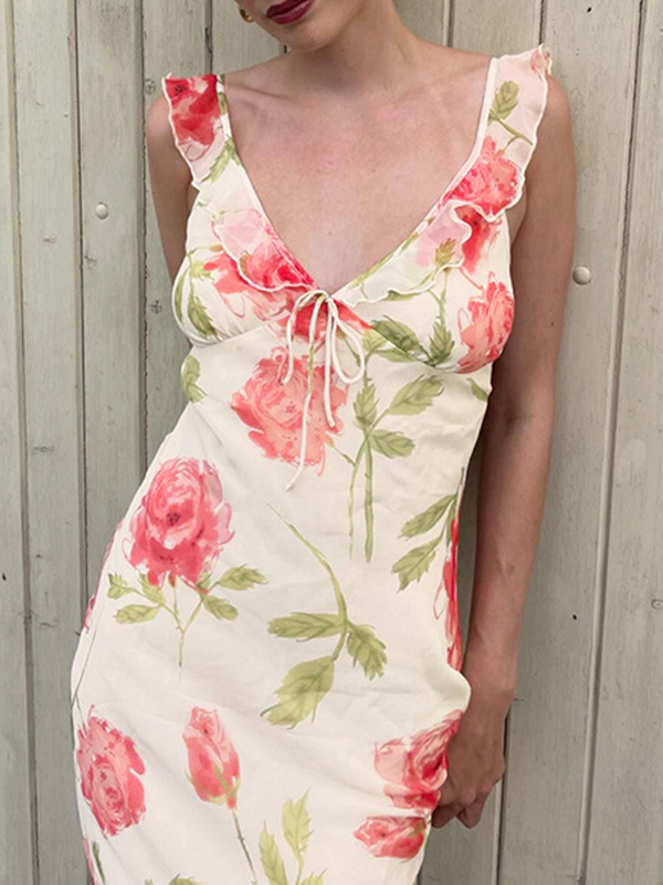 Trägerloses, geblümtes Kleid mit Fransen und Schlitzen