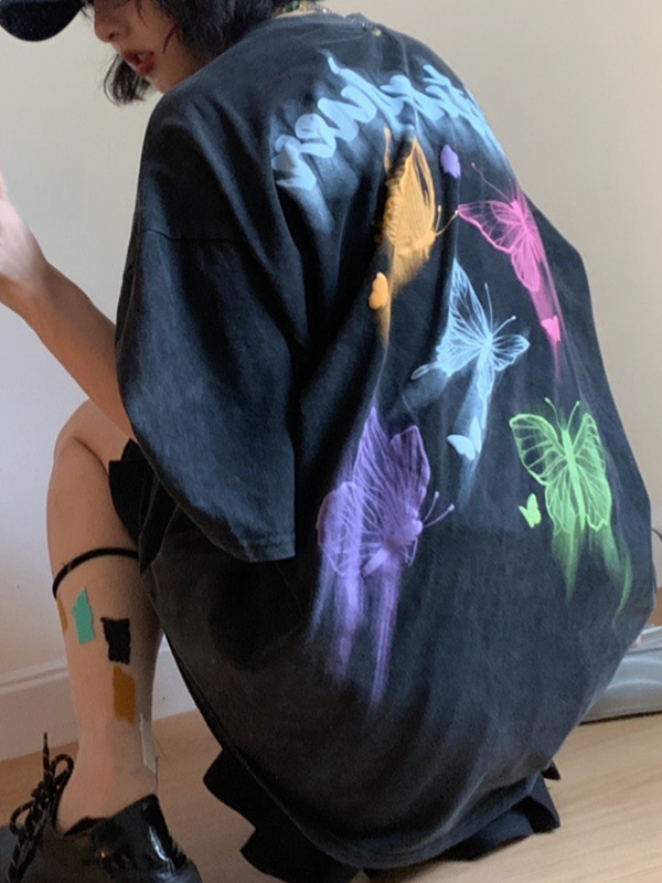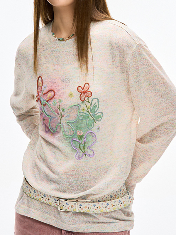Übergroßes Langarmshirt mit buntem Schmetterlingsstickerei und Sonnenschutz