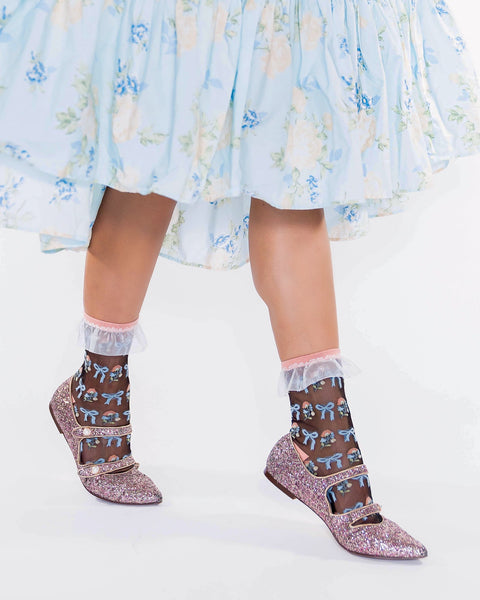 Svart, transparent ankelstrumpa med blommig rosett och volang mängd